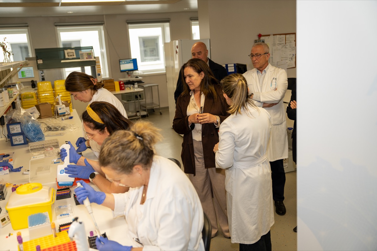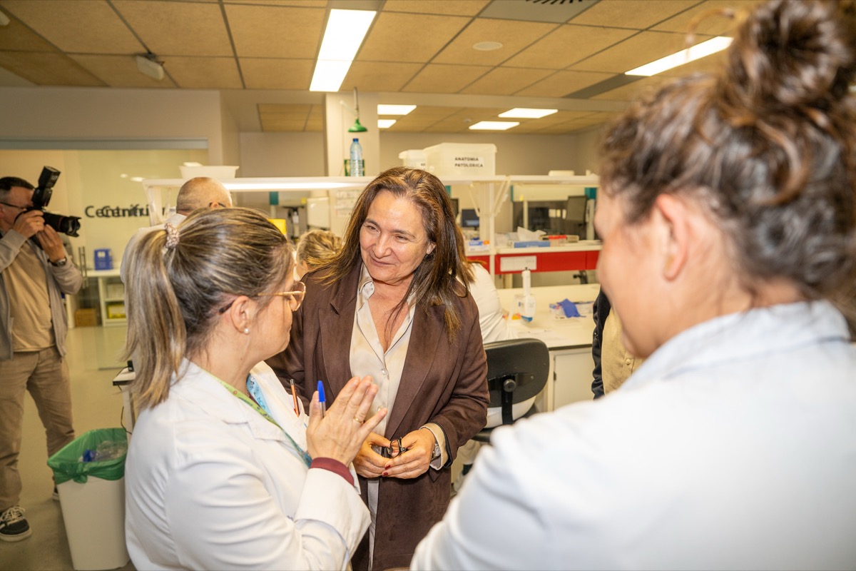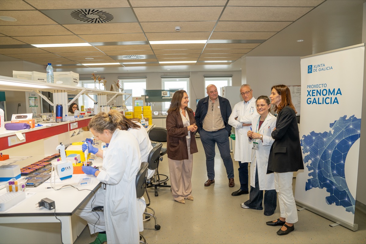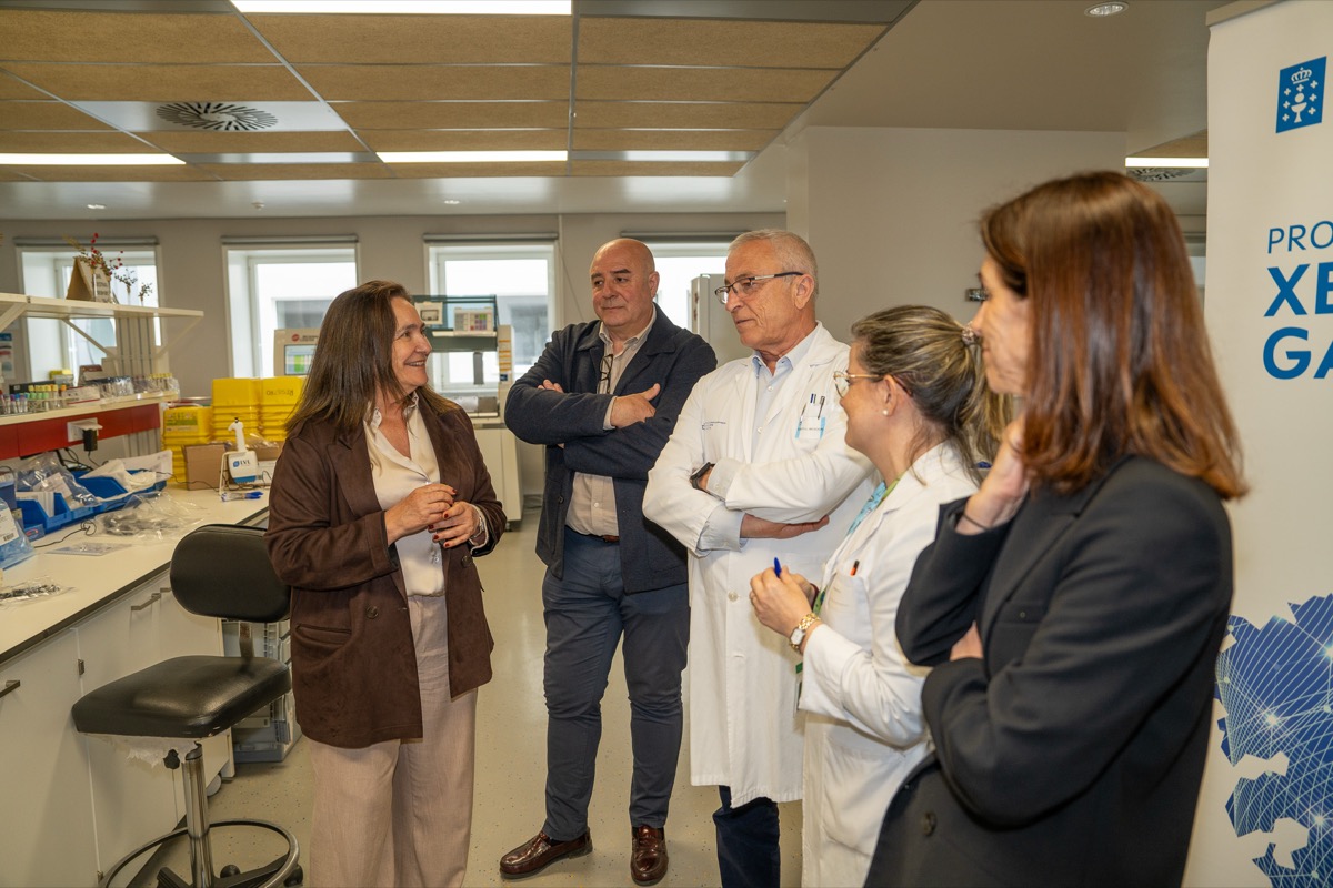 Ana Ortiz destacou os avances en investigación que se poden acadar grazas a este proxecto e o investimento da Xunta. Na visita tamén estiveron presentes o xerente da área sanitaria, Javier Puente, as investigadoras da Fundación Pública Galega de Medicina Xenómica María Brión e Montse Santori, e o xefe de servicio de detección precoz de enfermedades de la Dirección xeral de Saúde Pública de la Consellería de Sanidade, Ángel Gómez Amorín.